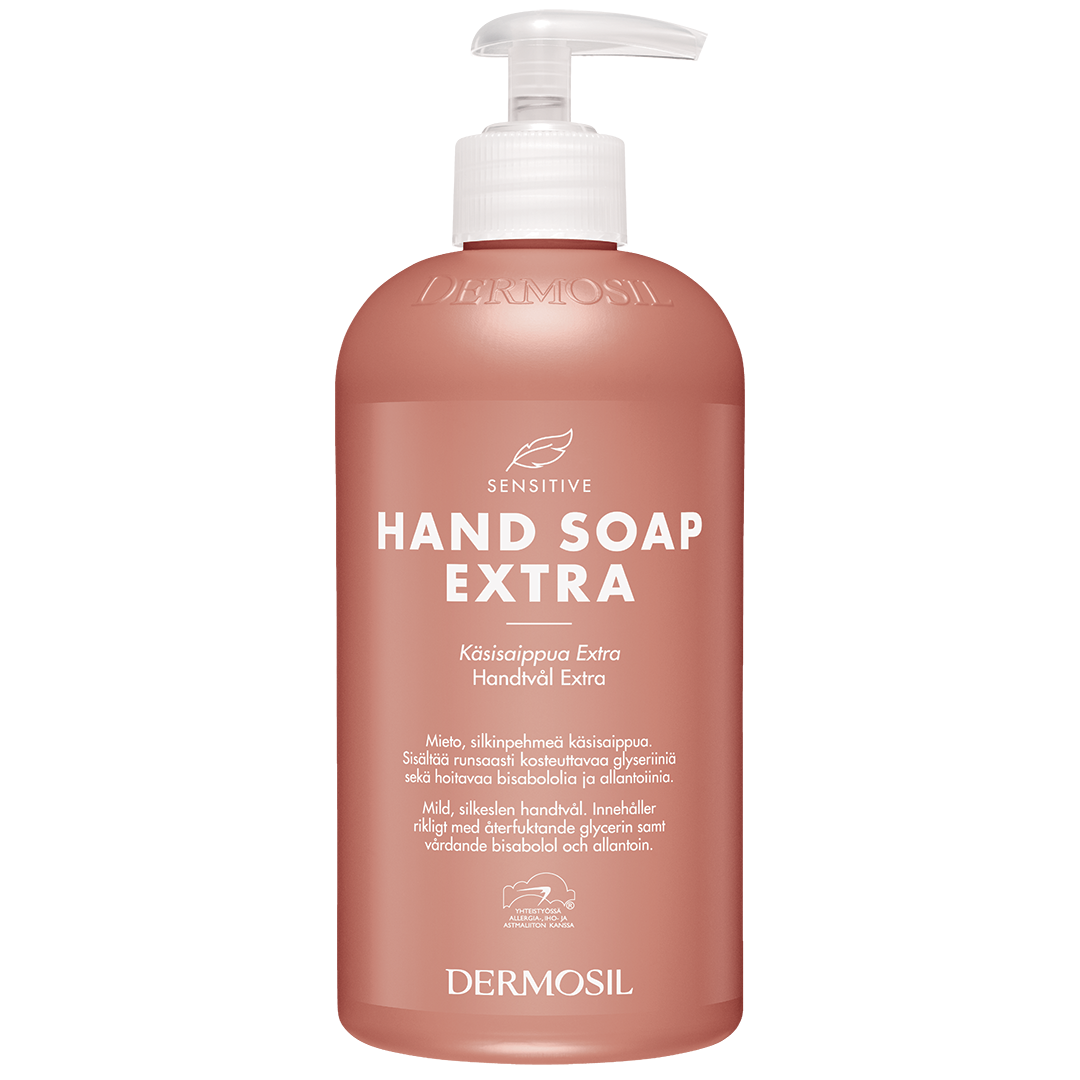 Erittäin mieto ja hajusteeton Dermosil Sensitive Käsisaippua Extra sisältää runsaasti ihoa kosteuttavia ja rauhoittavia ainesosia. Käsisaippua pumppupullossa on helmiäishohtoista, hajusteetonta nestesaippuaa, jonka koostumus on runsas ja joka vaahtoaa silkinpehmeästi.