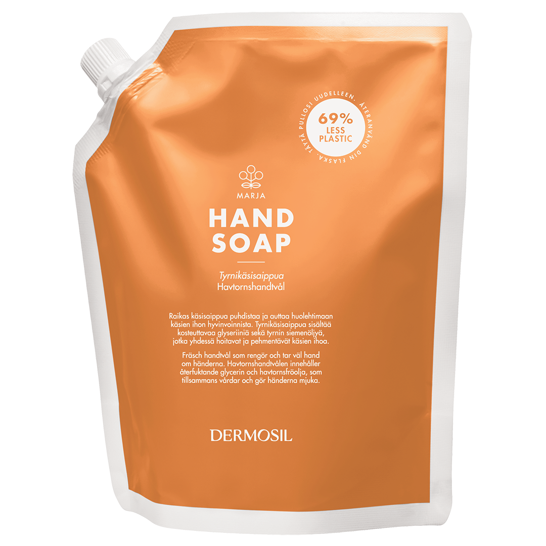 Dermosil Tyrnikäsisaippua sisältää kosteuttavaa glyseriiniä sekä tyrninsiemenöljyä, auringonkukansiemenöljyä ja rosmariininlehtiuutetta, jotka yhdessä hoitavat ja pehmentävät käsien ihoa. Tyrninsiemenöljyllä on myös ihon ikääntymistä hidastava vaikutus. Tuote sisältää puhdistavia tensidejä ja kosteuttavia ainesosia, minkä ansiosta Tyrnikäsisaippua sopii tuotteeksi toistuvaan käsien pesuun.