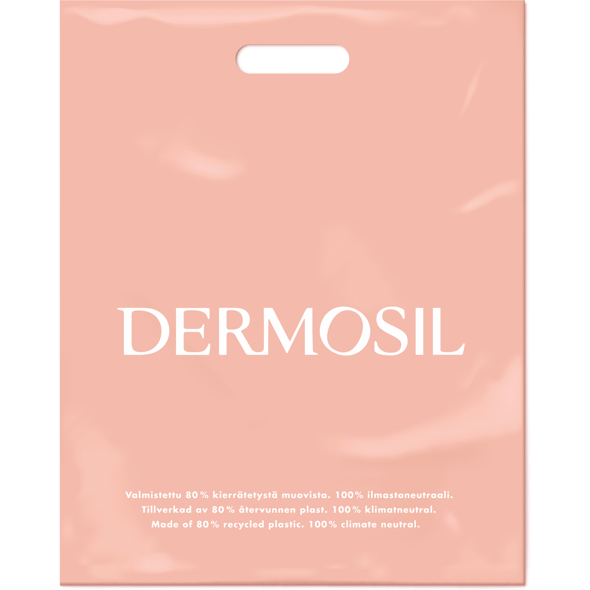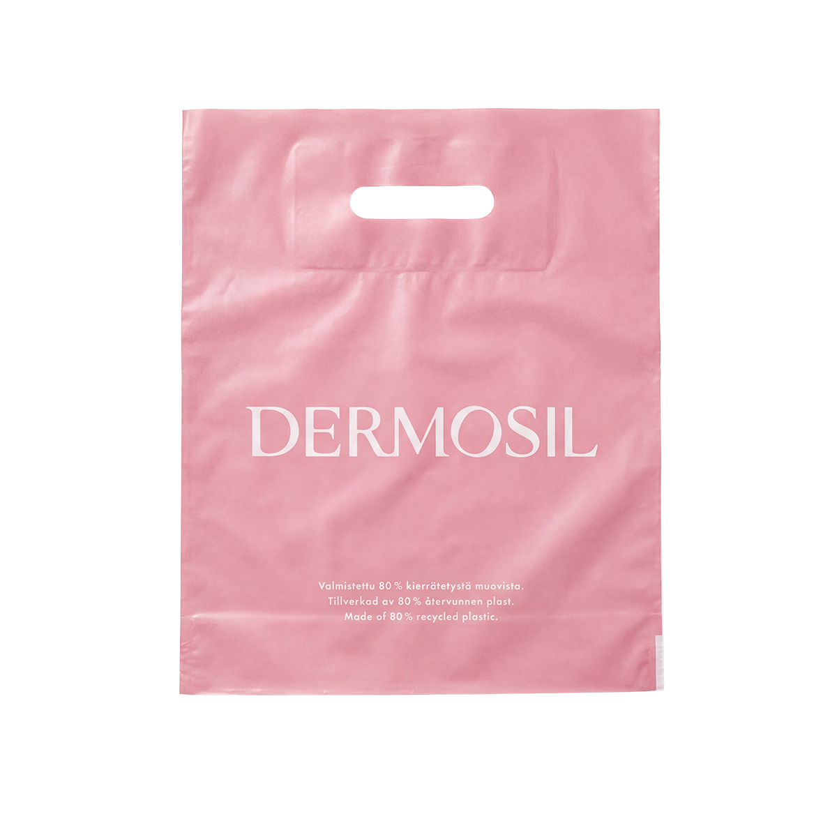 Kestävä kantoaukollinen muovipussi Dermosil-tuotteille.