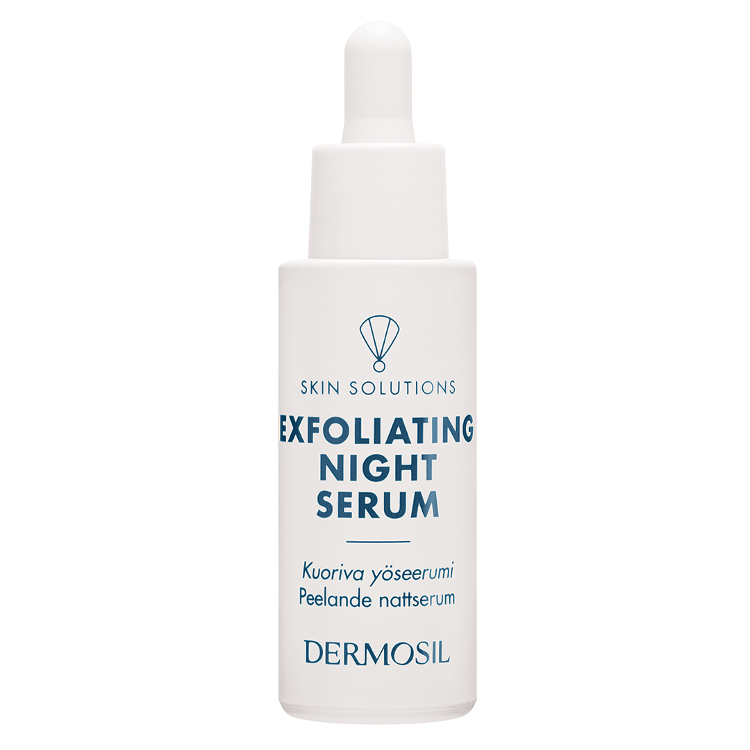 Dermosil Kuoriva yöseerumi palauttaa iholle kauniin hehkun. Se poistaa iholta kuolleen ihosolukon ja puhdistaa ihoa säännöllisesti käytettynä.
