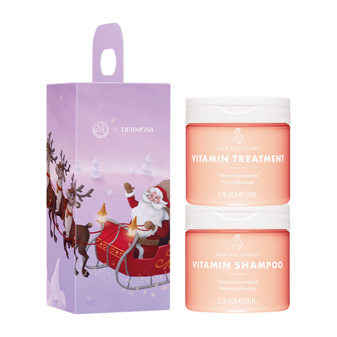 Lahjapakkaus Vitamiinihoito hiuksille sisältää Vitamiinishampoon ja Vitamiinihoitoaineen, täyteläiset ja kosteuttavat tehohoitotuotteet hiuksille.