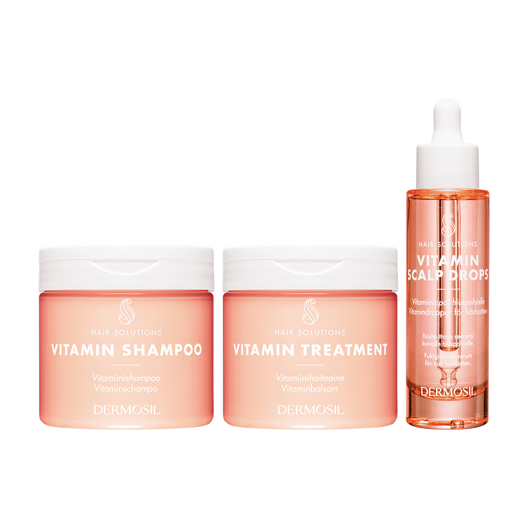 Voimaa vitamiineista -hiussetti sisältää kolme tuotetta hoitamaan hiuksista hyvinvoivat ja vahvat! Vitamiinishampoo, Vitamiinihoitoaine ja Vitamiinitipat hiuspohjalle yhdessä antavat hiuksille suojaa, kosteutta ja kiiltoa sekä tekevät hiuksista vahvemmat ja terveemmät.