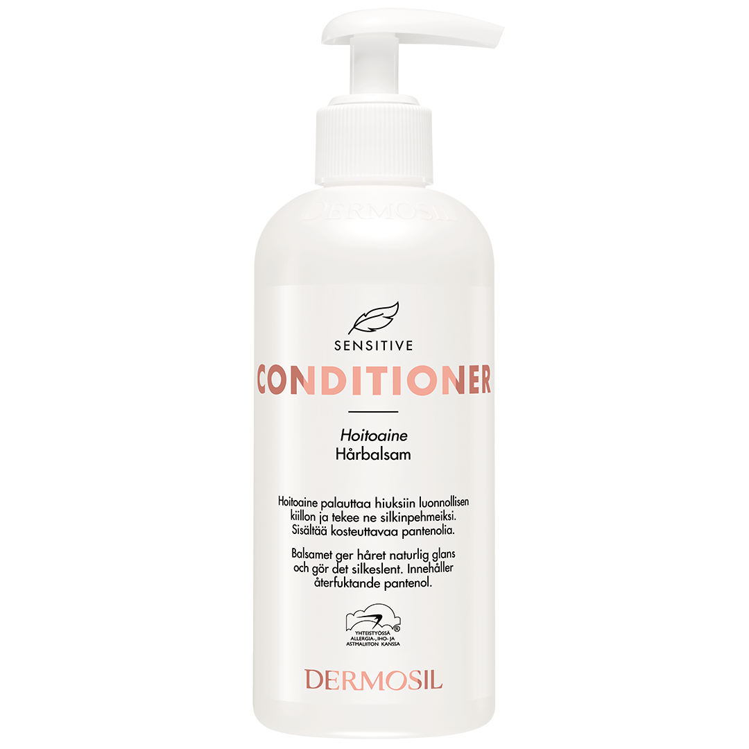 Sensitive Hoitoaine on hajustamaton ja silikoniton hoitoaine, joka tekee hiukset silkinpehmeiksi ilman, että ne muuttuvat raskaiksi. Hoitoaine sopii hentojen hiusten ja herkän hiuspohjan hoitoaineeksi sekä atooppiselle iholle. Se sopii koko perheelle, myös alle 3-vuotiaille lapsille.