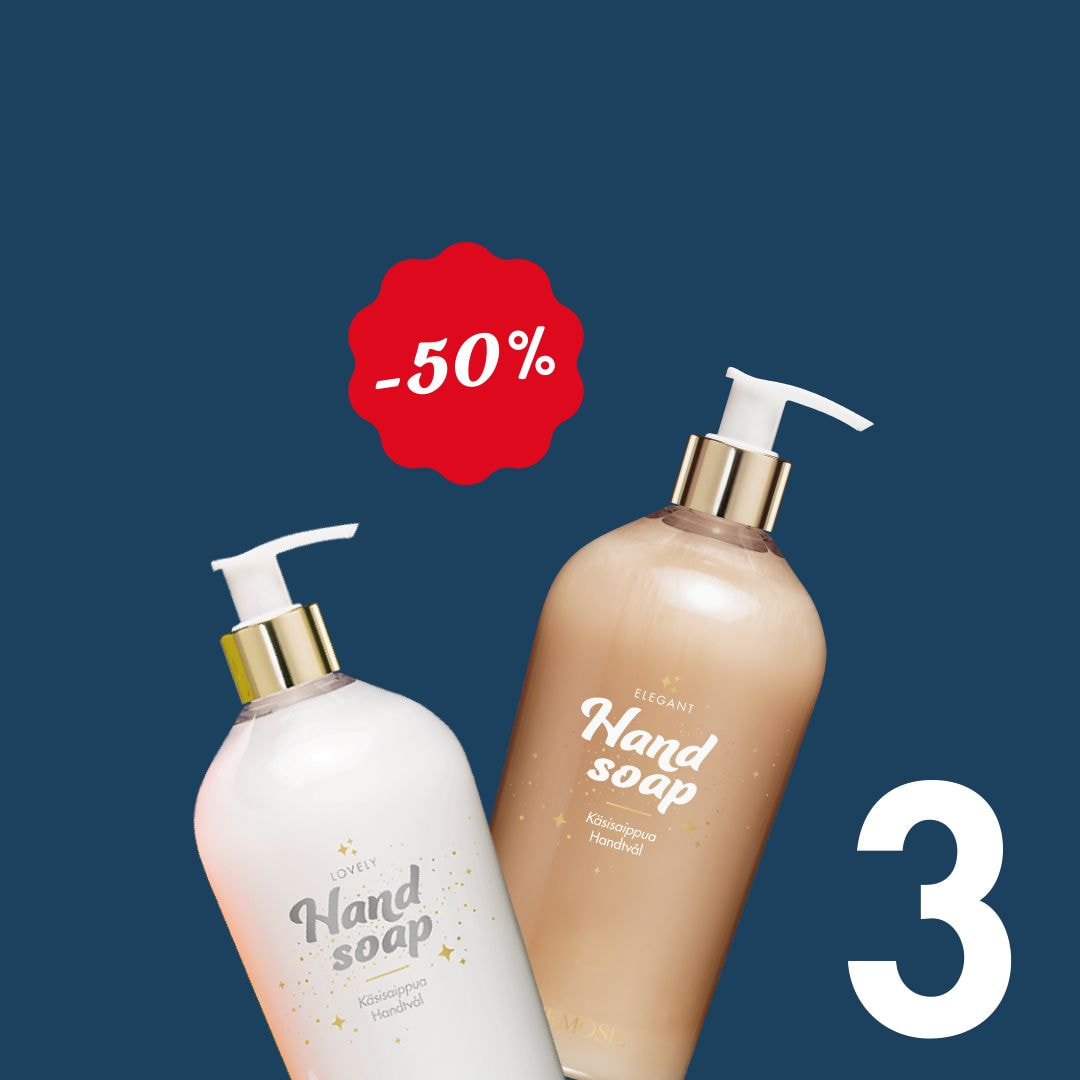 Käsisaippua Lovely (2464) ja Käsisaippua Elegant (2465) alehintaan 3.75 € (norm. 7.50 €).