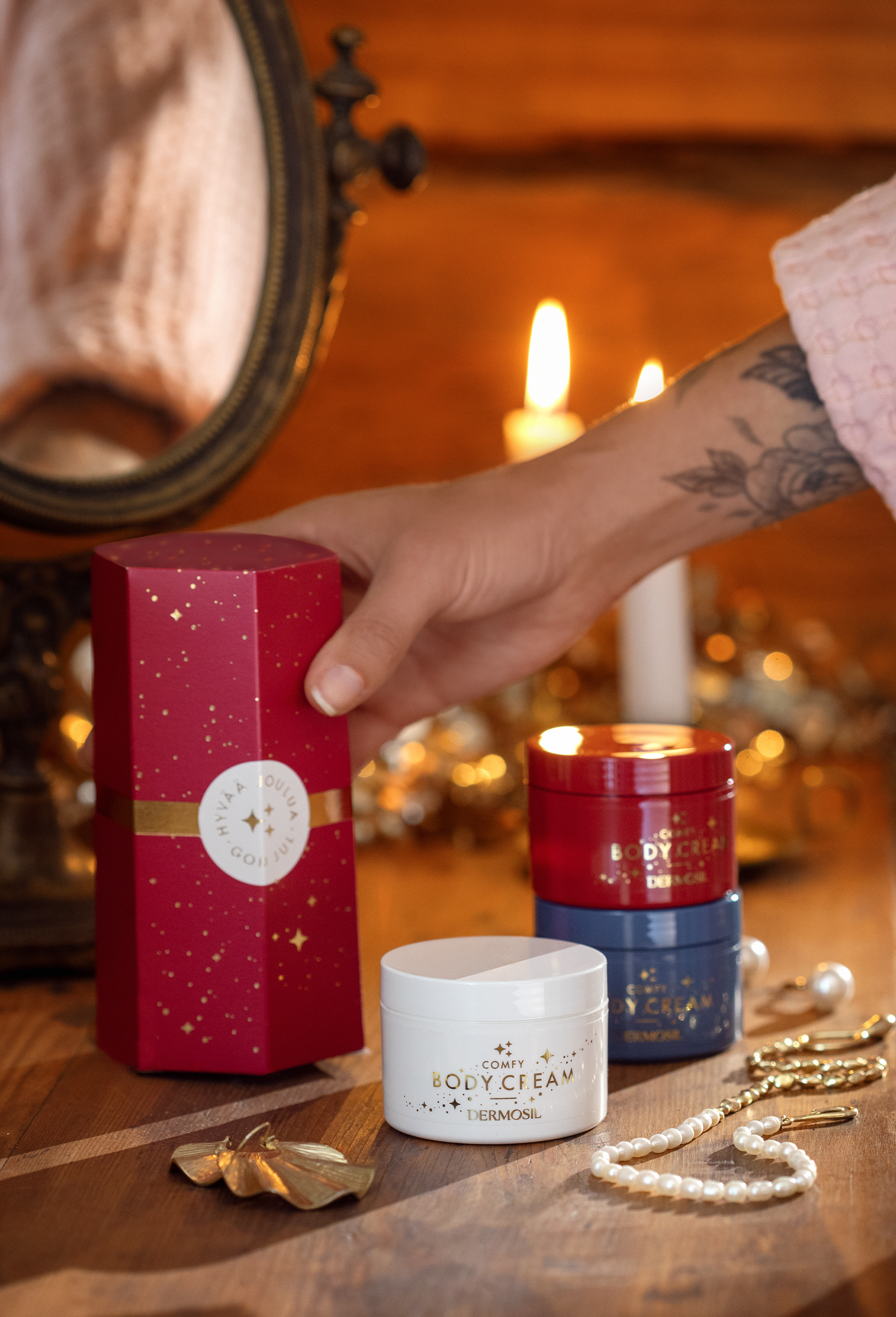 Joulupakkaus Comfy on upea ihonhoitolahjapakkaus, joka pitää sisällään kolme taivaallisen pehmeää ja täydellisen ylellistä vartalovoidetta hemmottelemaan kuivaa vartalon ihoa.