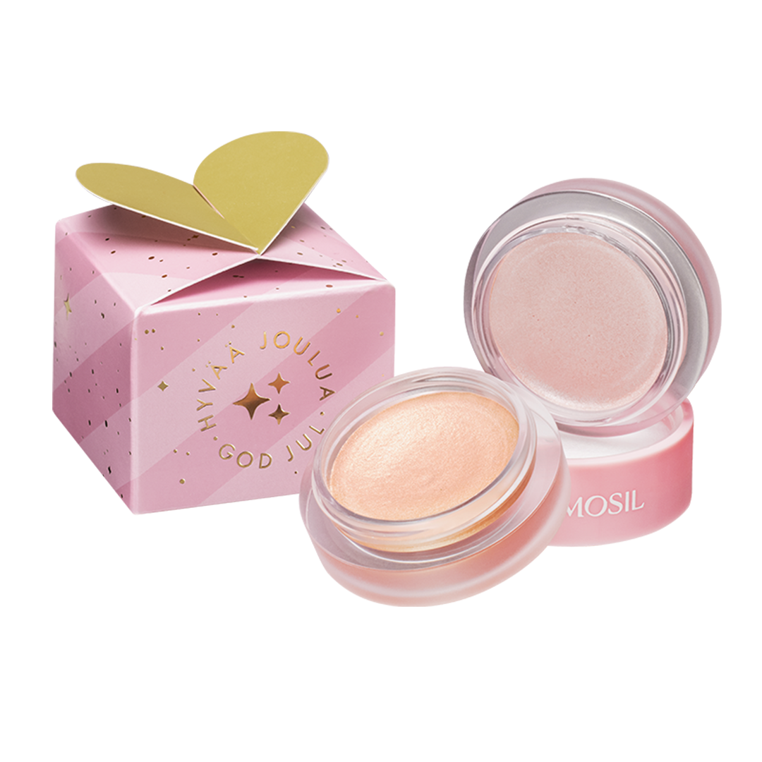 Joulupakkaus Cool & Cosyn söpö purkki kätkee sisäänsä kaksi voidemaista korostusväriä. Toinen väreistä, Cool Pink, on sävyltään kylmä roosa, aavistuksella hopeanhohdetta. Cosy Gold on sävyltään lämpimän kullanhohtoinen. Kauniit sävyt sopivat kaikille ihosävyille.