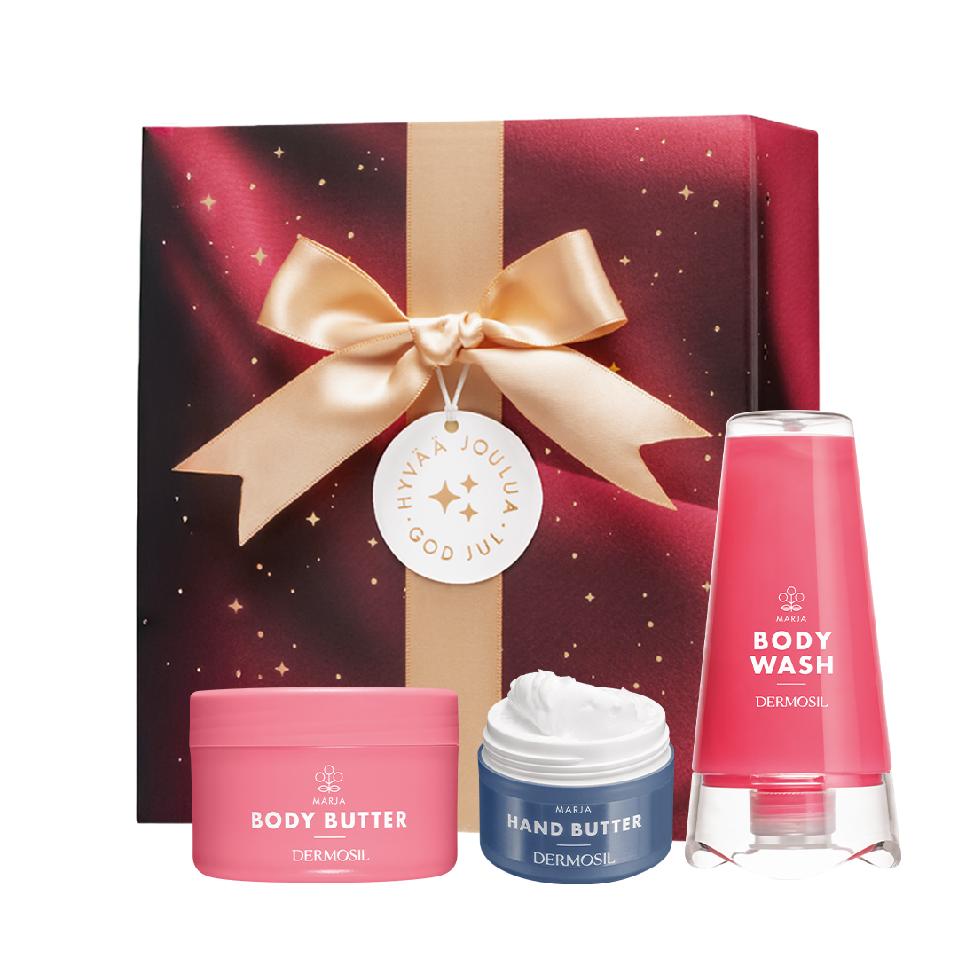 Lahjapakkaus Marja sisältää kaksi valikoimamme herkullista vadelmatuotetta, Vadelmasuihkugeelin ja Vartalovoi Vadelman, sekä herkullisen mustikkaisen Käsivoide Mustikan. Tuotteiden sisältämät aidot marjojen siemenölyt tekevät tästä ihonhoitolahjasta vastustamattoman ihanan!