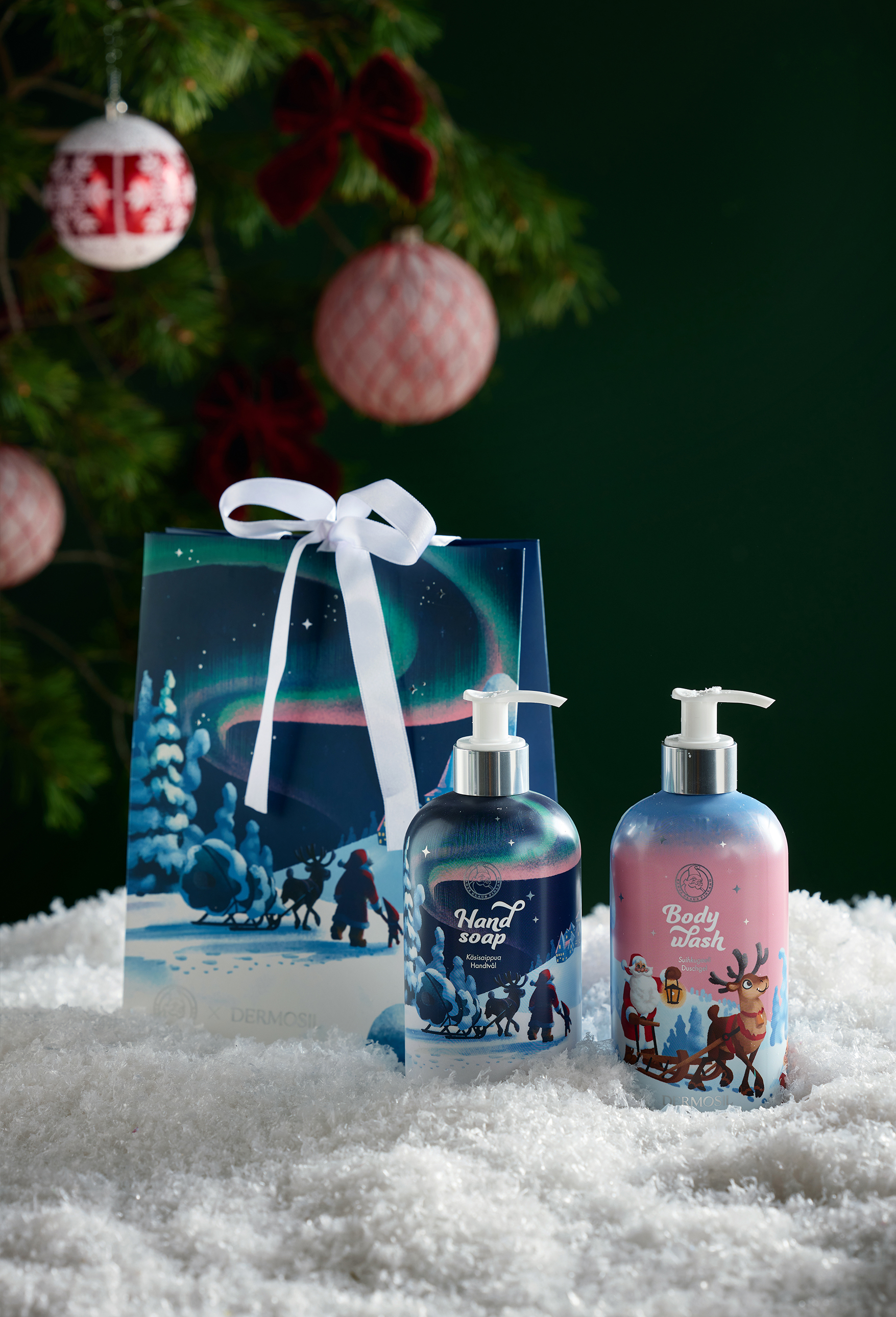Joulusaippuoissa tuoksuu makea ja mausteinen talviomena ripauksella kirsikankukkaa. Pullot on kuvitettu kauniilla joulupukkikuvituksella.
