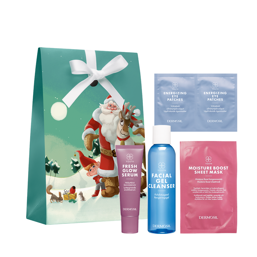 Lahjapakkaus Youth sisältää varta vasten nuoren ihon tarpeisiin kehitetyt, hellävaraiset mutta toimivat tuotteet. Puhdistusgeeli, Moisture Boost Kangasnaamio, Virkistävät silmänympäryslaput sekä Heleyttävä kasvoseerumi toimivat hemmottelevana lahjana myös aikuiselle iholle, joka kaipaa hehkua ja eloisuutta!
