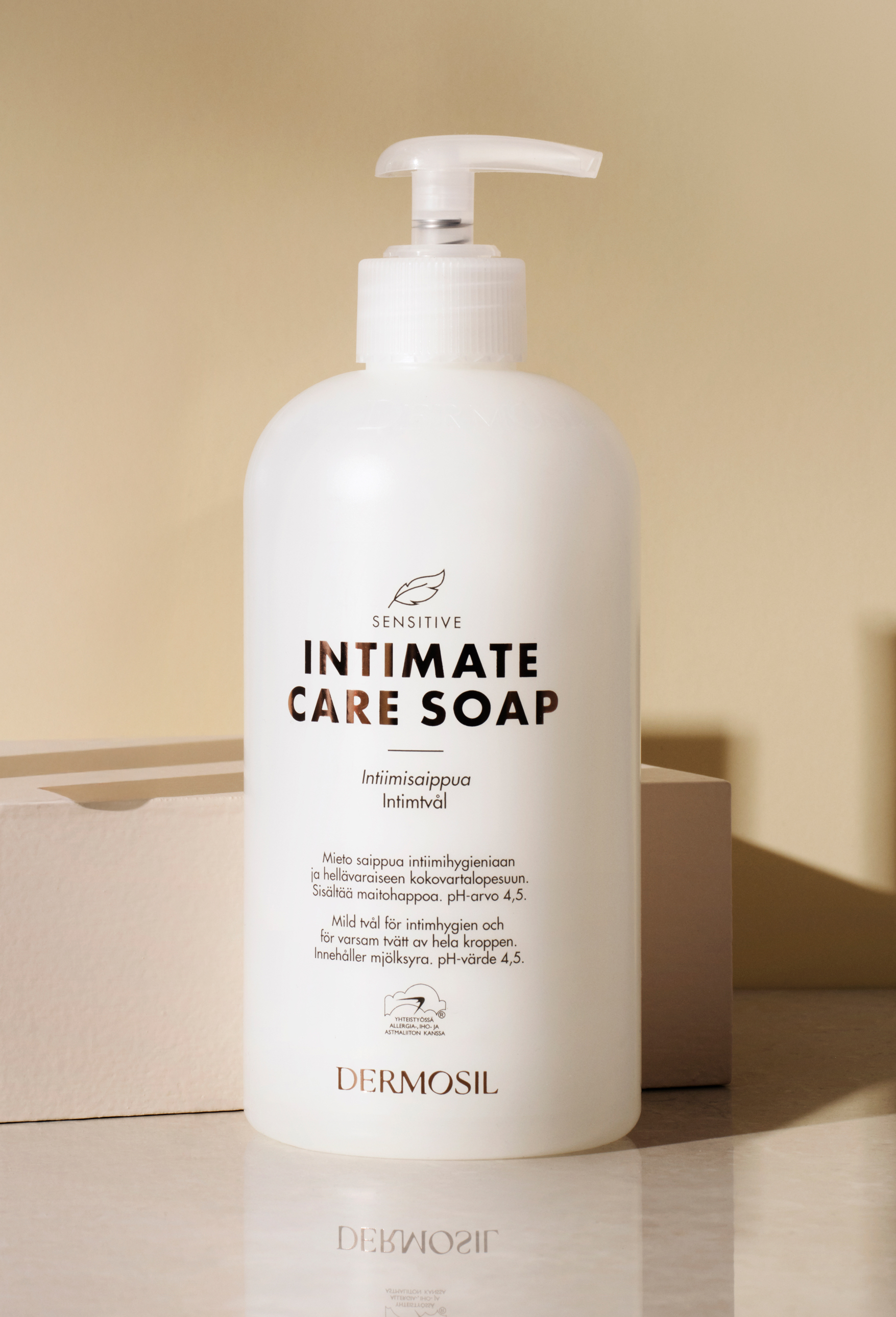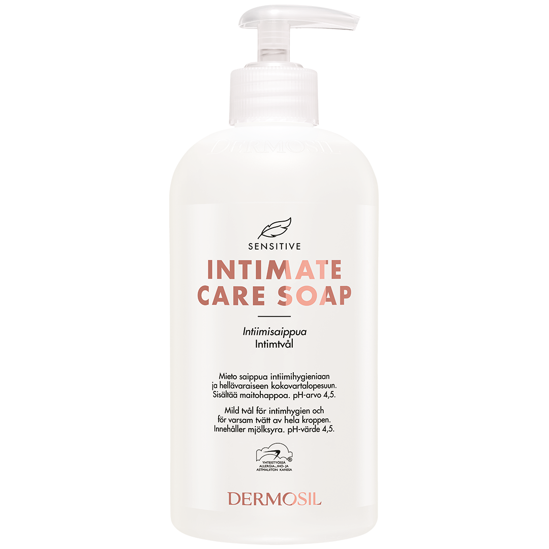 Dermosil Sensitive -sarjan turvallinen Intiimisaippua sisältää maitohappoa ja sen pH-arvo on 4,5. Alhainen pH-arvo on olennaista, jotta saippua sopisi intiimipesuun. Intiimipesuneste on miedosti vaahtoava ja tuntuu miellyttävältä käytössä. Sillä on myös jälleenkosteuttava vaikutus. Intiimisaippua on täysin väriaineeton ja hajustamaton.