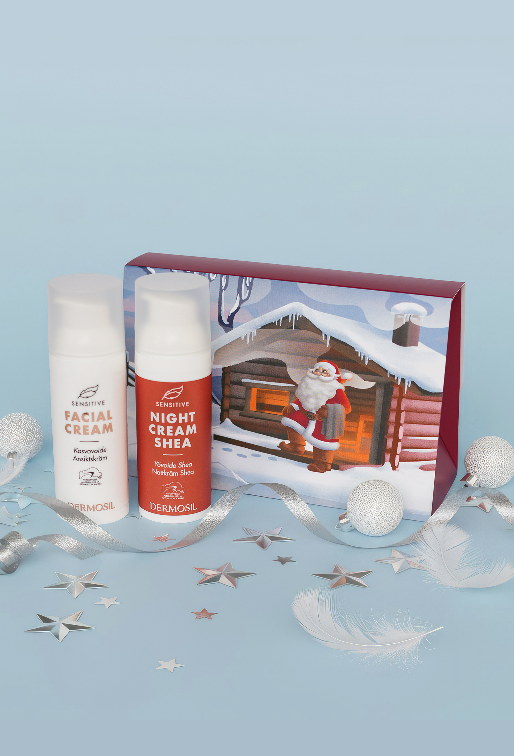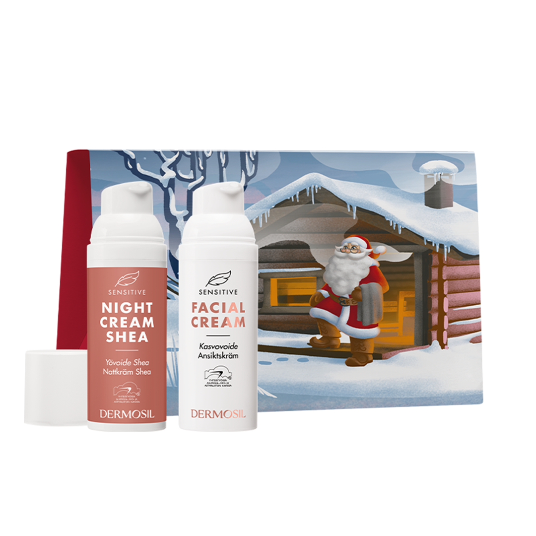 Lahjapakkaus Sensitive Päivä- ja yövoide sisältää rakastetut kasvovoiteet kuivalle, herkälle ja atooppiselle iholle. Kevyempi voide päivävoiteeksi ja täyteläinen yövoiteeksi.