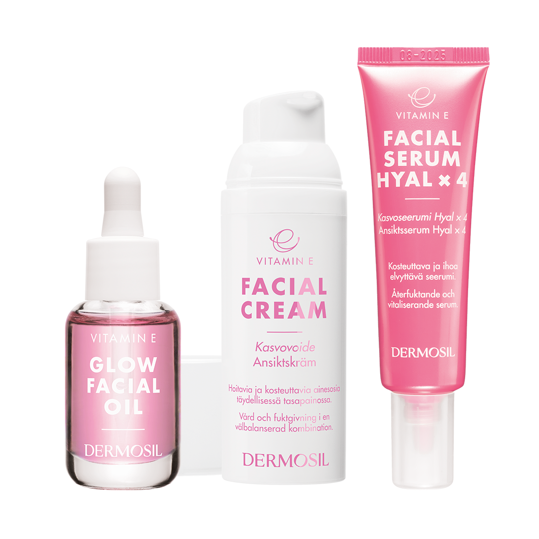 - Tehokkaasti kosteuttava hyaluronihapposeerumi ja E-vitamiini kasvovoide
