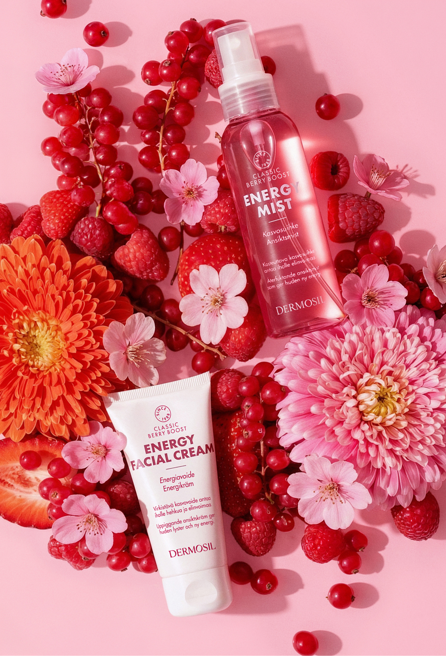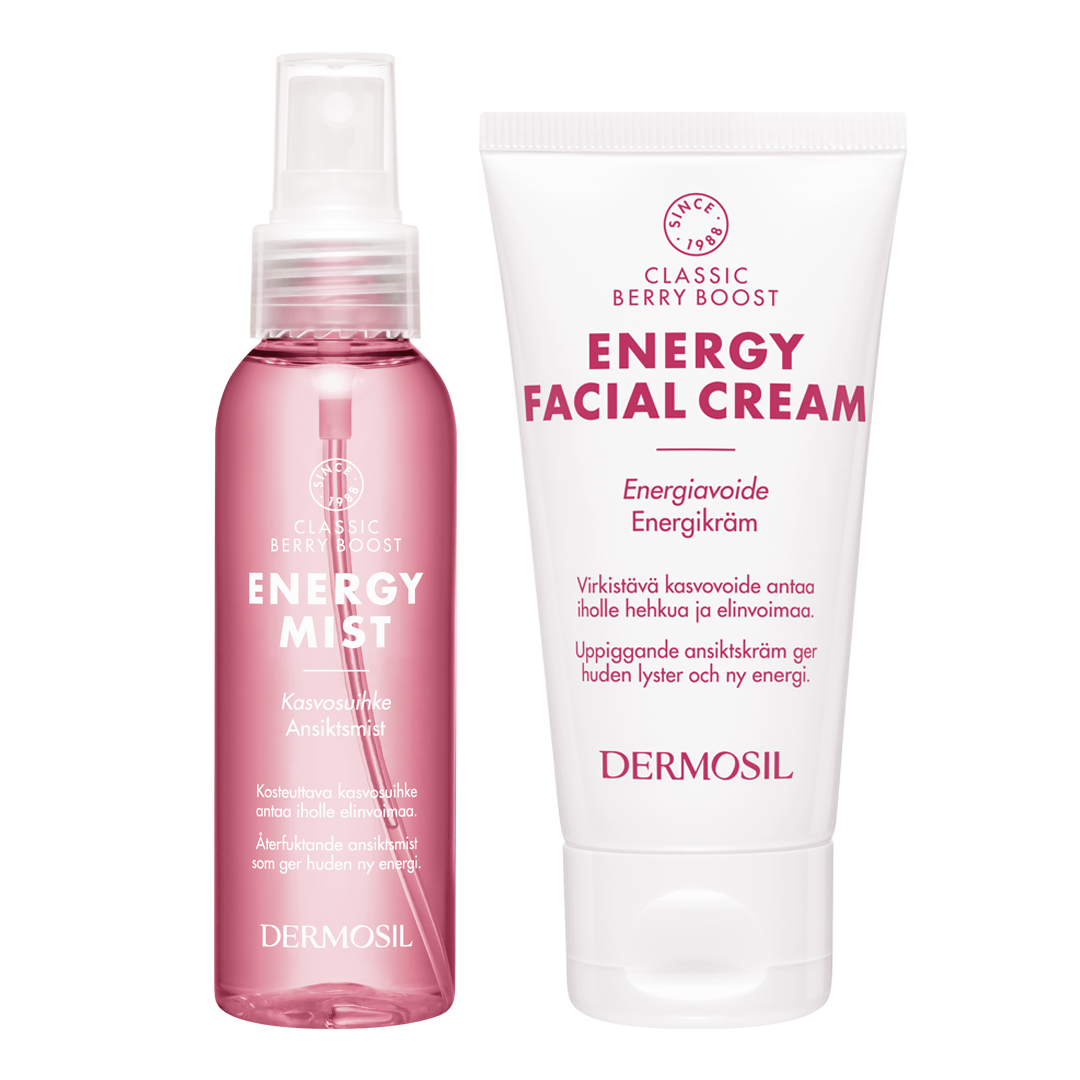 Berry Boost Energiasetti tuo kasvojen iholle välitöntä kosteutusta, energiaa ja elinvoimaa. Tuotesetti sisältää raikkaan Berry Boost Kasvosuihkeen sekä tehokkaasti kosteuttavan Berry Boost Energiavoiteen, jotka yhdessä tukevat ihon kosteustasapainoa.