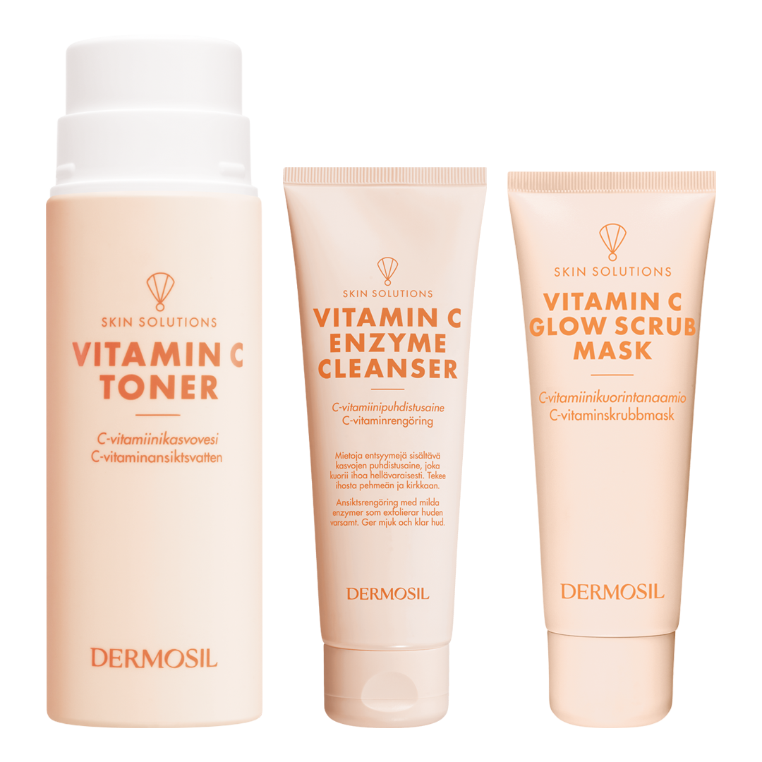 Haluatko sileän, pehmeän ja heleän ihon? C-vitamiinia sisältävä tuotesetti on kokonaisvaltainen ihon puhdistusrutiini, joka kirkastaa, kuorii ja kosteuttaa kasvojen ihoa tehokkaasti. Hehkua iholle -puhdistus sisältää C-vitamiinikuorintanaamion, C-vitamiinipuhdistusaineen sekä C-vitamiinikasvoveden, jotka yhdessä palauttavat iholle sileän pinnan ja luonnollisen hehkun.