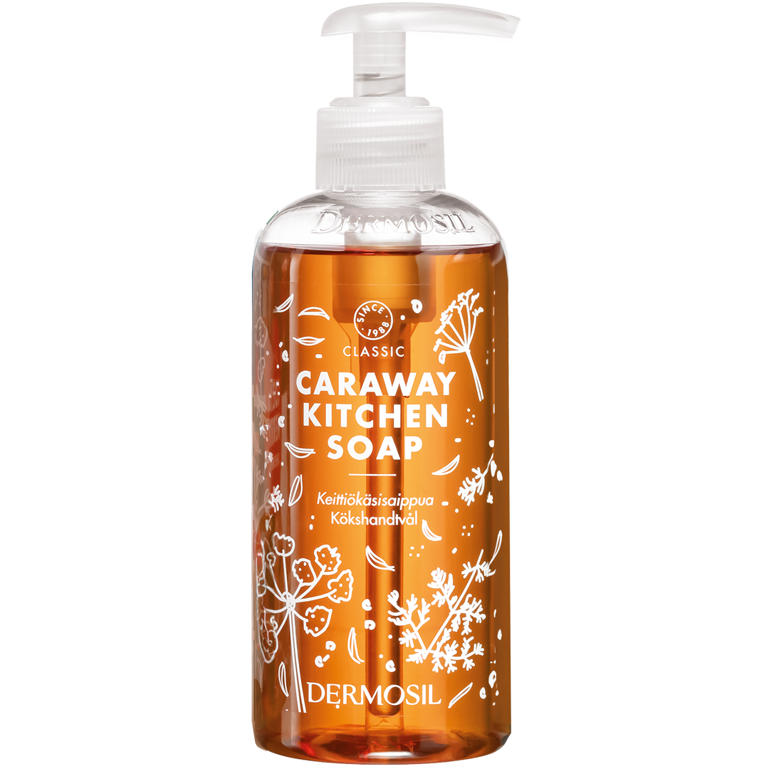 Kuminan siemeniä on kasvatettu eri puolilla Suomea ja jalostettu öljyksi Pohjanmaalla. Saippua sisältää myös kotimaista koivunmahlaa. Kaunis pakkaus piristää keittiön sisustusta ja on ilo silmälle.