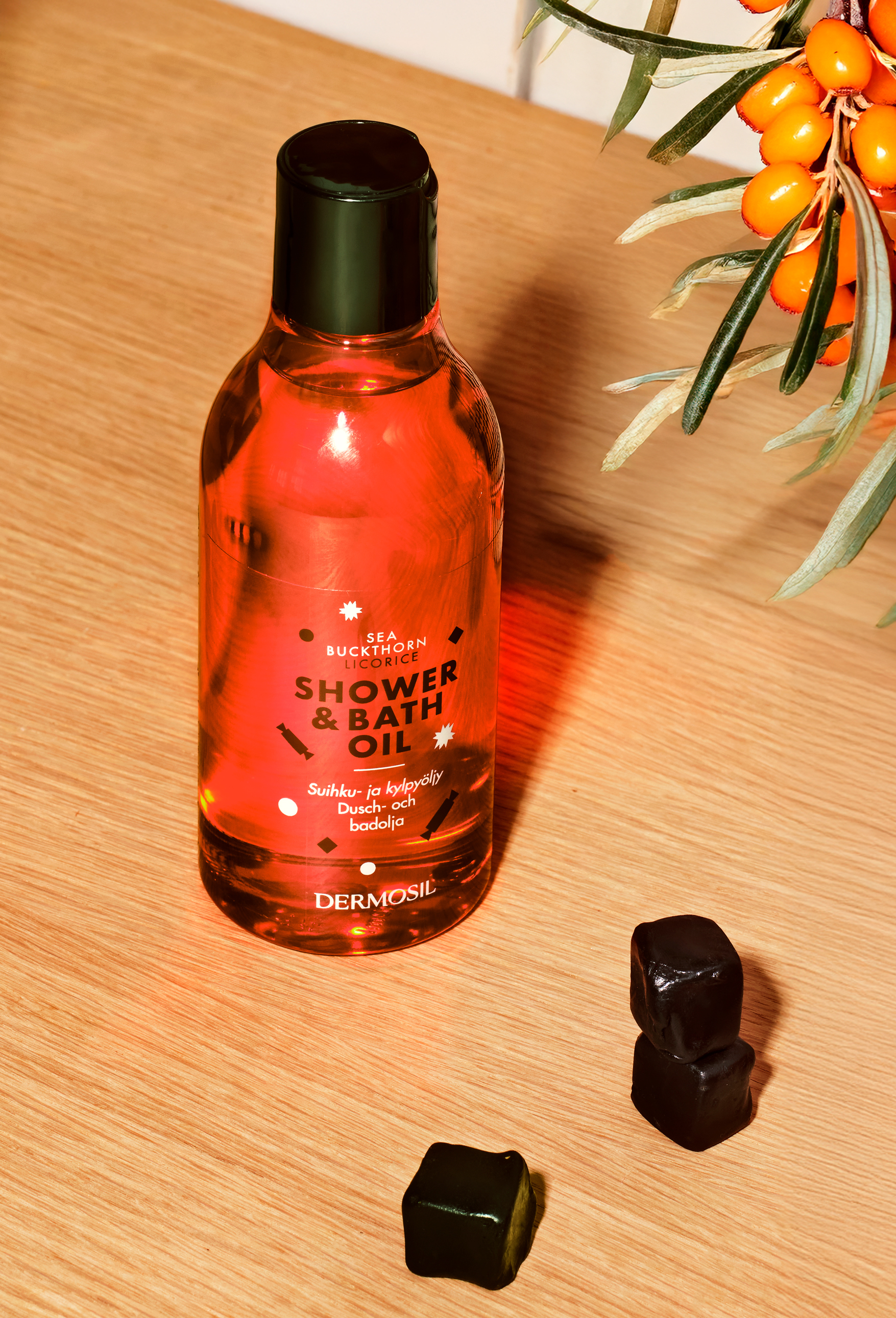 Lempeä tyrnin ja lakritsin tuoksuinen suihku- ja kylpyöljy jättää ihon miellyttävän pehmeäksi.