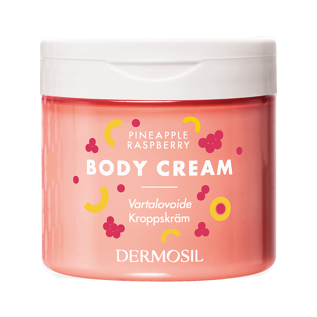 Saisiko olla jotain makeaa? Tehokkaasti kosteuttava hedelmäisen tuoksuinen vartalovoide sisältää vadelma- ja ananasuutteita.