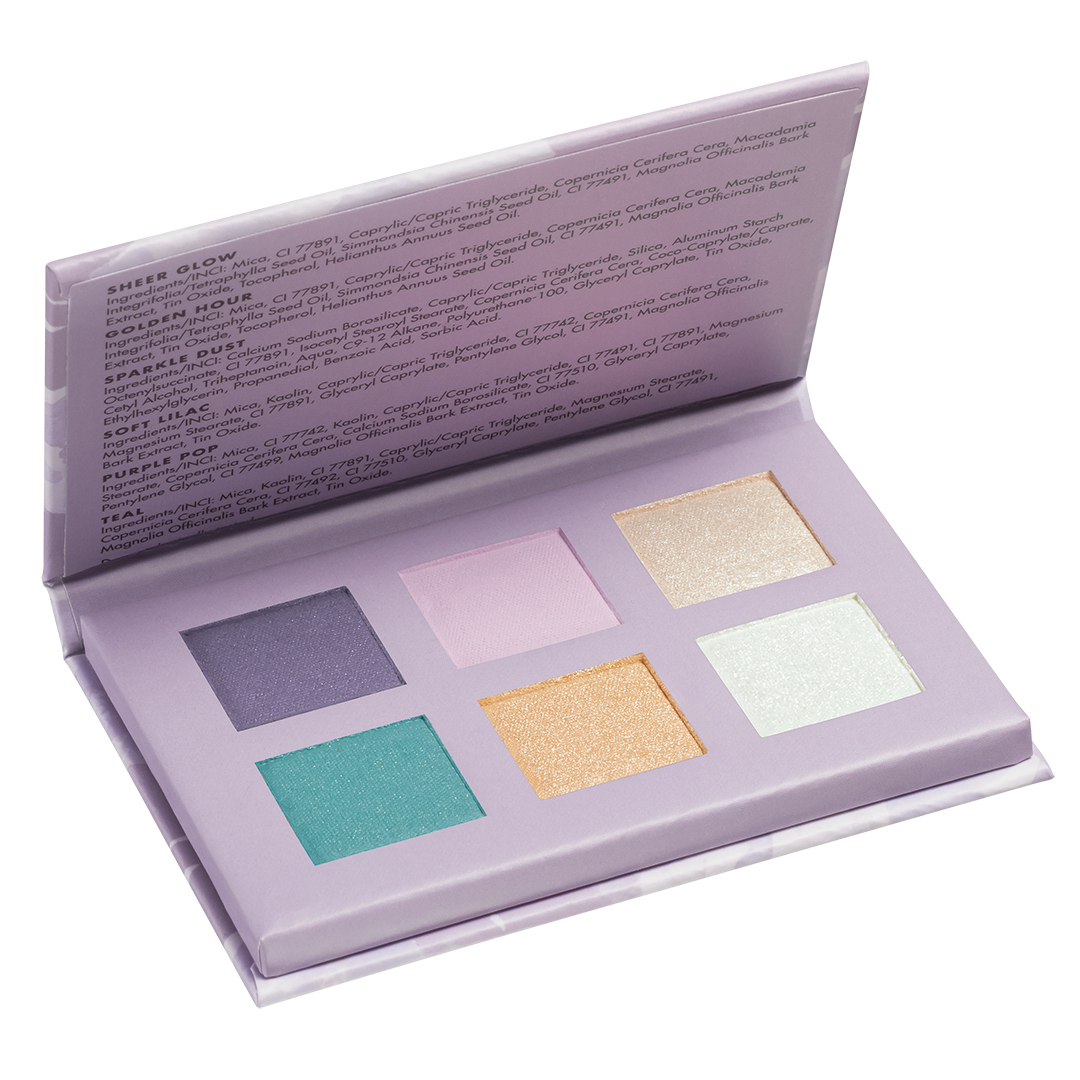 Luomiväripaletti Midnight Haze on monipuolinen paletti, joka pitää sisällään kuusi kaunista säyyä. Vaaleanliila, tummanliila ja tummanturkoosi sopivat monenlaisiin tyyleihin. Lisäksi paletti sisältää kimaltelevan sävyn, hennon helmiäishohtavan sävyn ja pehmeän kullanhohtoisen sävyn, jotka toimivat myös korostusväreinä kasvojen korkeimmissa kohdissa, kuten poskipäillä ja kulmaluulla.