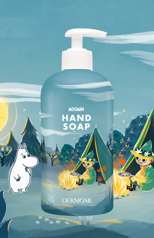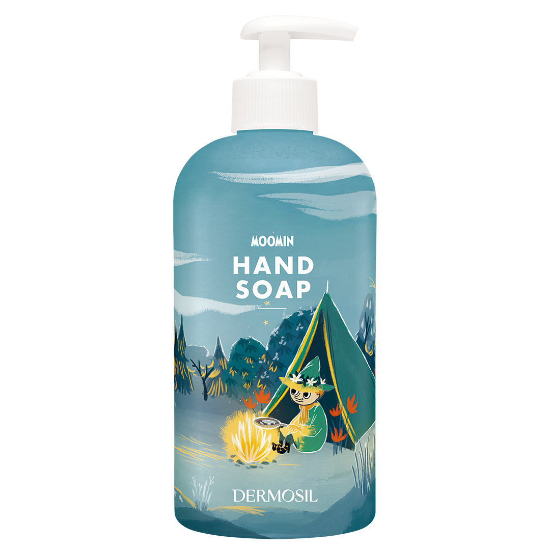 Muumi Käsisaippua Tähtiyön tunnelmallinen kuvitus on tarinasta Muumipeikko ja Lohikäärme. Saippualla on hedelmäinen ja marjaisa tuoksu, jossa on vivahteita mansikasta ja banaanista.