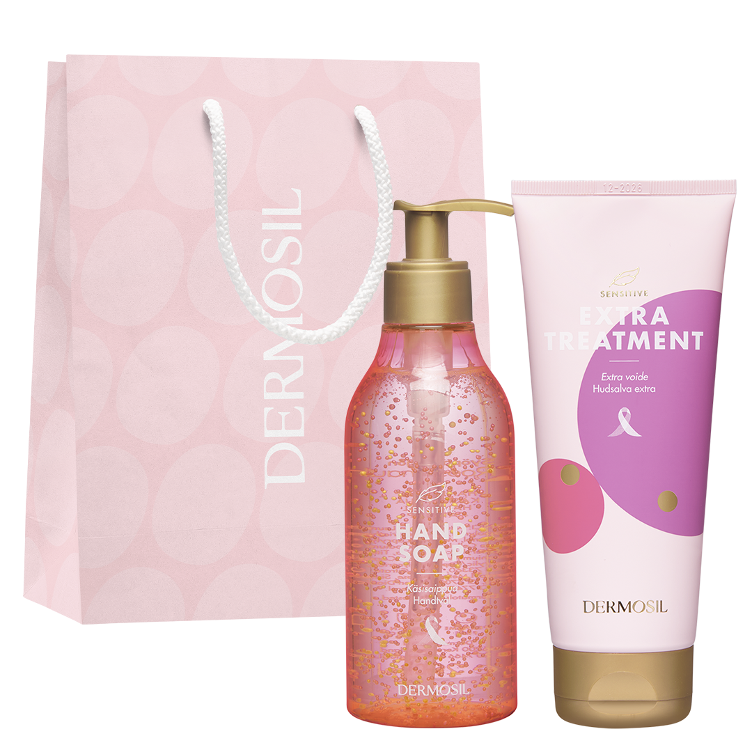 Hellä iholle -setti pitää sisällään Roosa nauha -kokoelman Sensitive Käsisaippuan ja Sensitive Extra voiteen sekä kauniin Dermosil-lahjakassin. Tämä hellävarainen setti on täydellinen joululahja herkälle iholle.