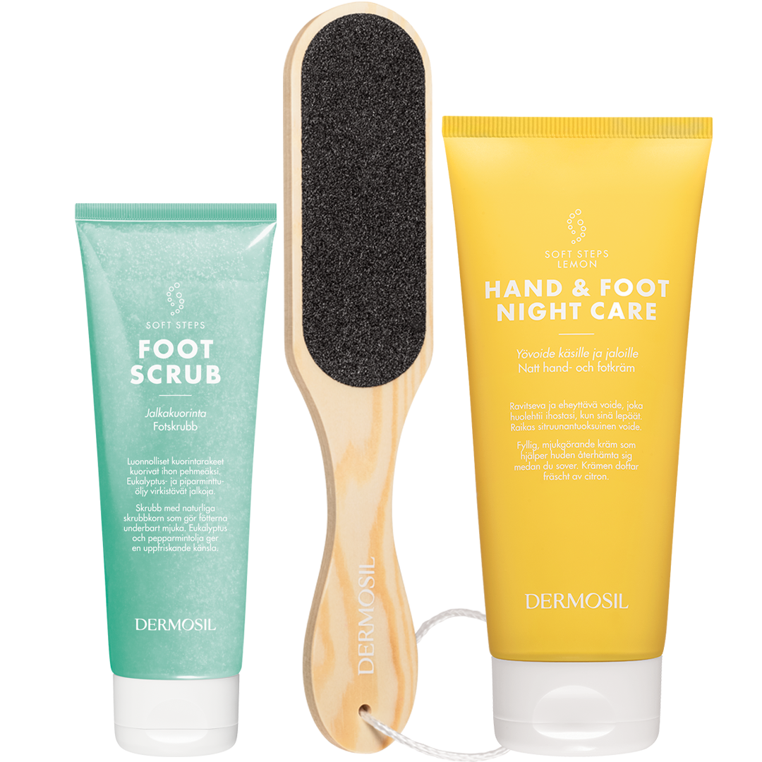 Pehmeät jalat -setti sisältää kolme ylellistä ja tehokasta tuotetta hoitamaan jalkojesi ihosta pehmeän.