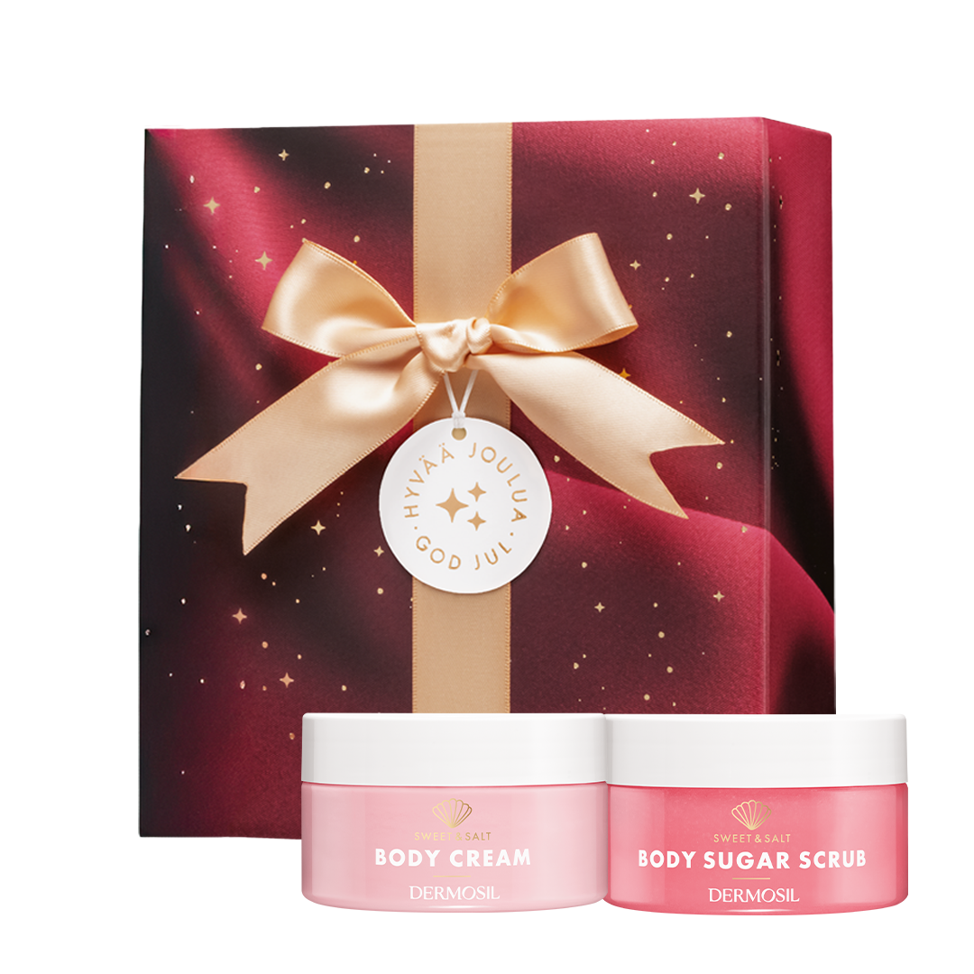 Lahjapakkaus Sweet & Salt Vartalonhemmottelu kätkee sisäänsä upeat tuotteet hoitamaan vartalon ihosta unelmanpehmeän. Sweet & Salt Vartalon sokerikuorinnan ja Sweet & Salt Vartalovoiteen suolaisten ja makeiden raaka-aineiden kiinnostava liitto hellii ihoa.