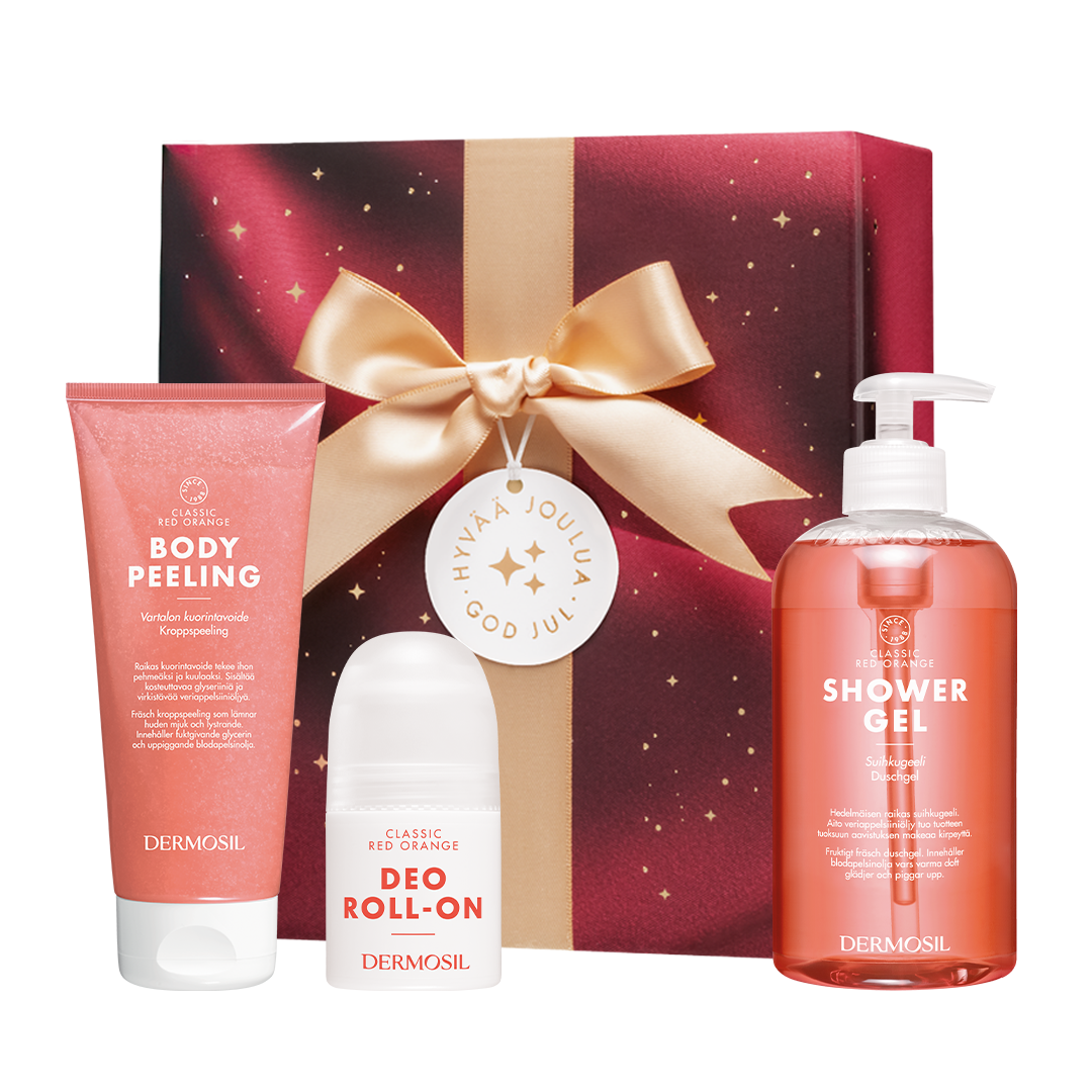 Lahjapakkaus Punainen appelsiini sisältää kolme rakastettua punainen appelsiini -tuotetta vartalon ihon hoitoon: suihkugeelin, vartalon kuorintavoiteen sekä deodorantin. Makean kirpeä ja raikas veriappelsiinin tuoksu tuo ihanaa vastapainoa talveen.