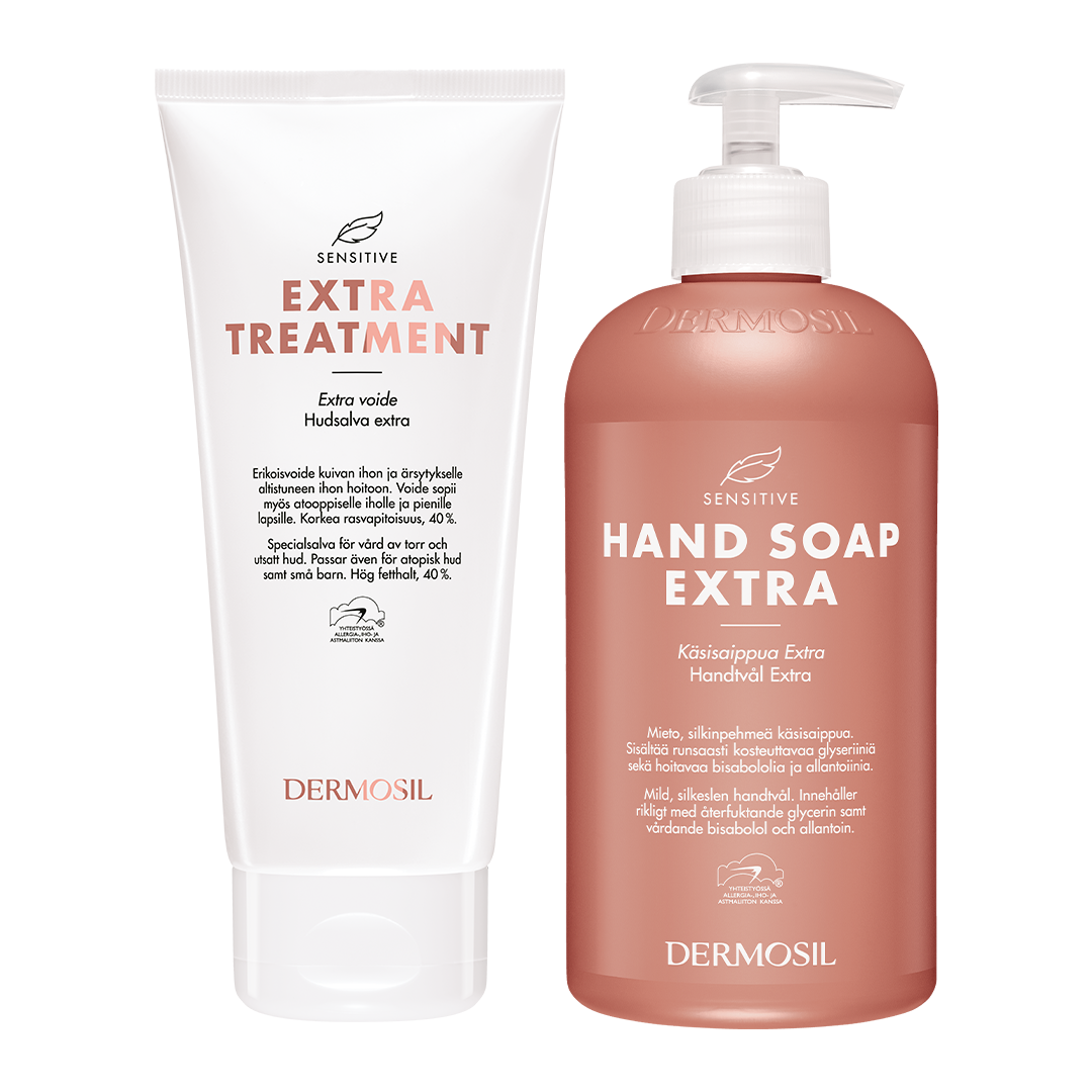 Valikoimamme rakastetut Extra-tuotteet, Sensivite Käsisaippua Extra ja Sensitive Extra voide, ovat suositut koko perheen luottotuotteet.
