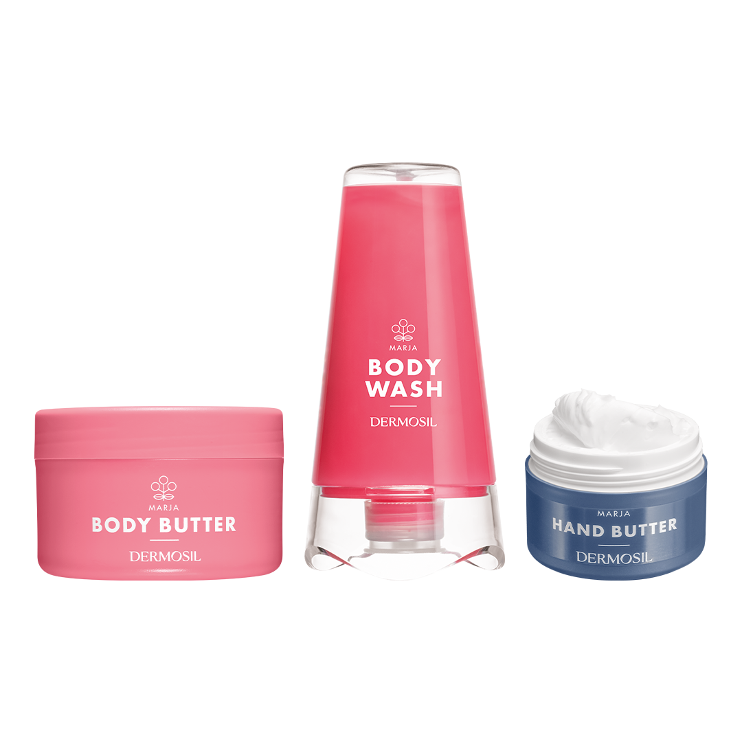 Marja-setti sisältää kaksi valikoimamme herkullista vadelmatuotetta, Vadelmasuihkugeelin ja Vartalovoi Vadelman, sekä herkullisen mustikkaisen Käsivoide Mustikan. Tuotteiden sisältämät aidot marjojen siemenölyt tekevät tästä ihonhoitolahjasta vastustamattoman ihanan!