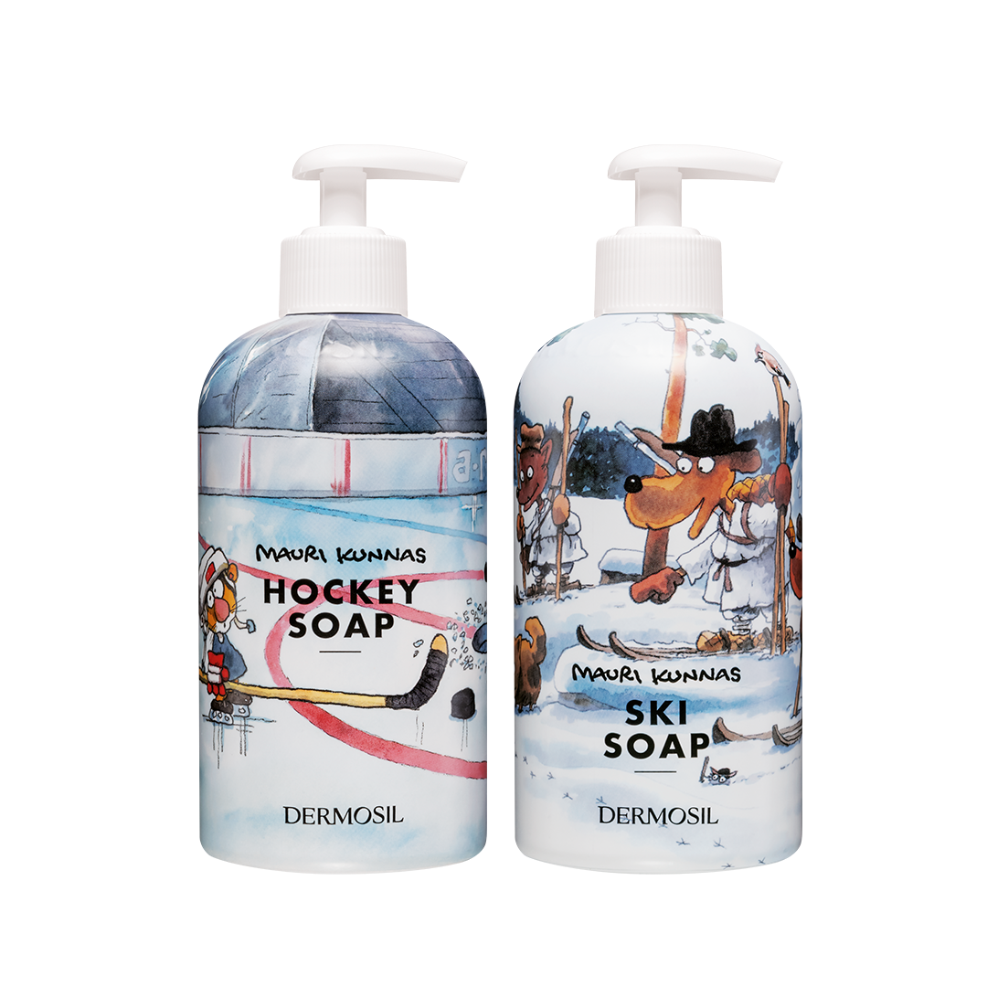 Talvinen tuotesetti sisältää kotimaisen suihkusaippuan ja käsisaippuan, jotka saavat olon raikkaaksi talviurheilun jälkeen. Tuotteiden hauska Mauri Kunnas -kuvitus saa hymyn huulille!