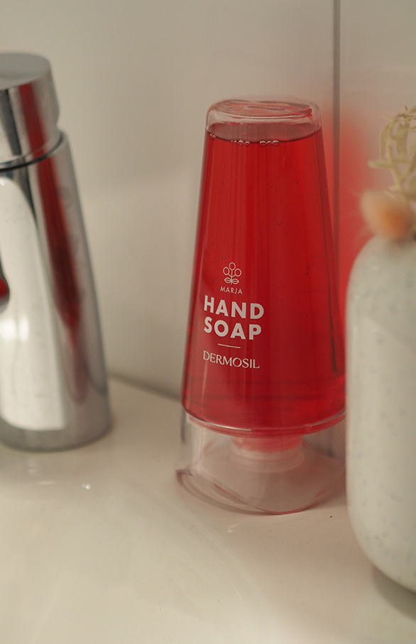 Raikkaan punaisessa Puolukkasaippuassa on hurmaava puolukoiden tuoksu. Asiakkaidemme toiveesta Puolukkasaippua on taas saatavilla näyttävässä kartionmallisessa pullossa, joka piristää kylpyhuoneen sisustusta.