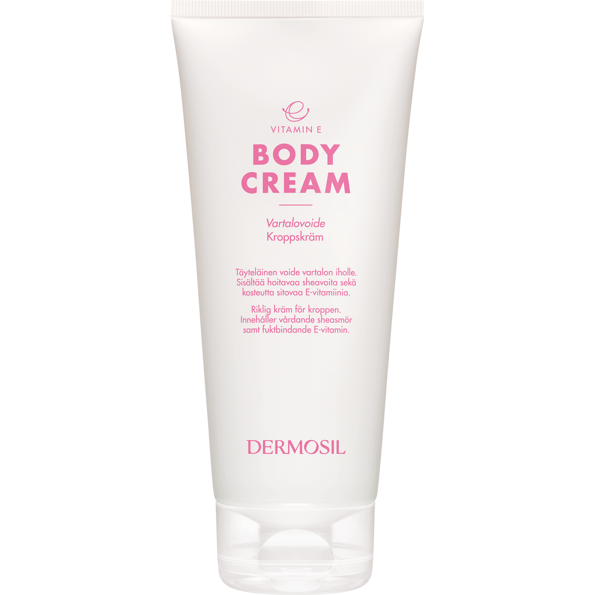 Koe Dermosilin Vitamin E Vartalovoide, jonka täyteläinen koostumus kosteuttaa ihoa tehokkaasti. Vartalovoide sisältää antioksidanttista E-vitamiinia, pehmentävää sheavoita ja kosteuttavaa glyseriiniä, jotka yhdessä hoitavat ihoa. Voide on pakattu kätevään tuubiin, joka on helppo kuljettaa mukana. Vartalovoide on miedosti hajustettu ja tuoksu on sama kuin Vitamin E-sarjan muissa tuotteissa. Pakkaus on kierrätettävä.